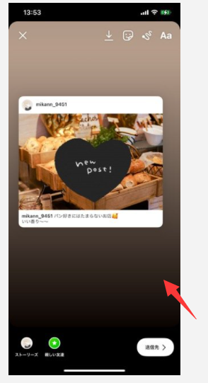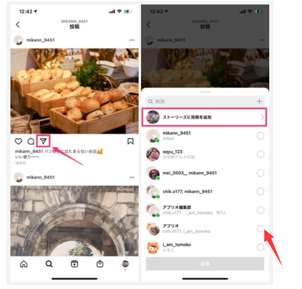 紙飛行機マークをタップ「ストーリーズに投稿を追加」をタップ
