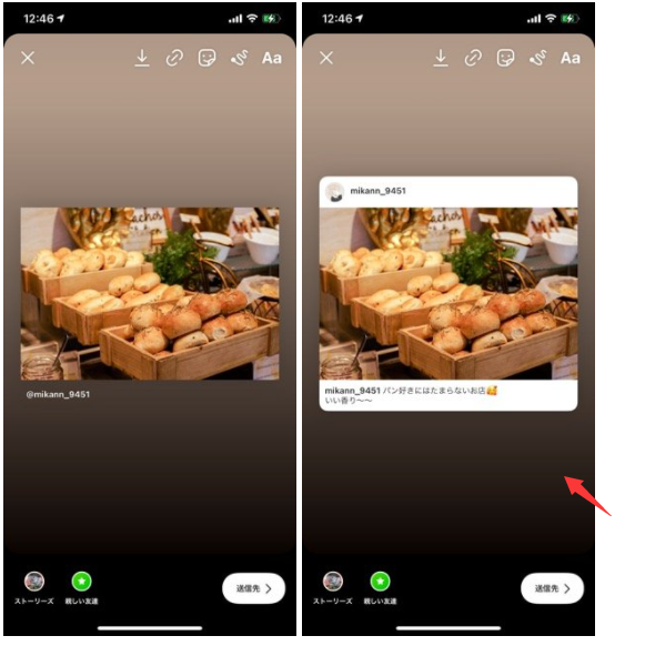 ストーリー編集画面へと遷移したら、リポスト投稿のサイズや位置を調整しましょう。また、文字やスタンプなどの加工もおこなえます。