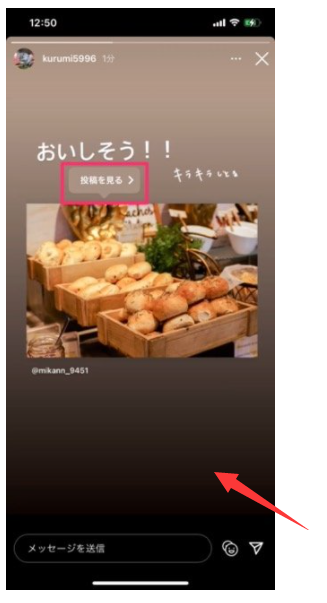 リポストされたストーリー投稿を閲覧者側から見た画面です。投稿部分をタップすると投稿を見るボタンが表示されるので、そこから元の投稿へ遷移して確認することができます。