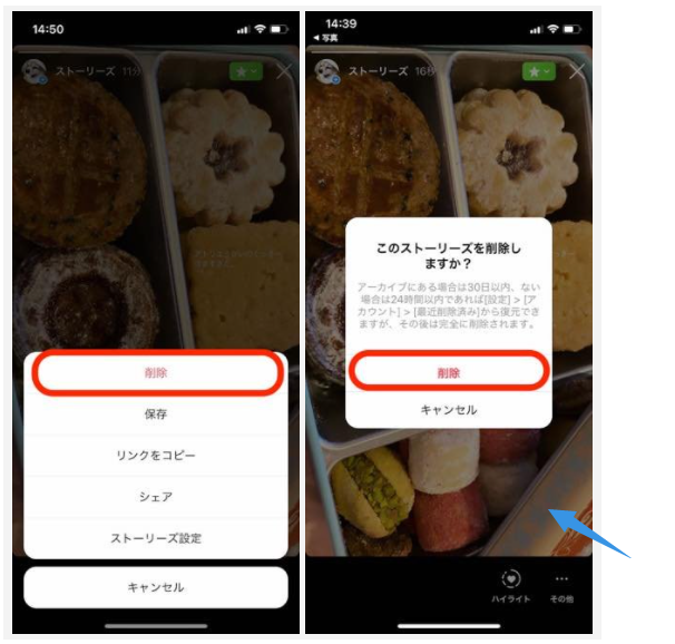 削除したストーリーは、「最近削除済み」に保管されています。保管期間は30日間ですが、ストーリーをアーカイブ保存に設定していない場合は要注意。投稿後24時間が過ぎると、「最近削除済み」に保管されたストーリーも完全削除されてしまいます(詳しくは後述)。