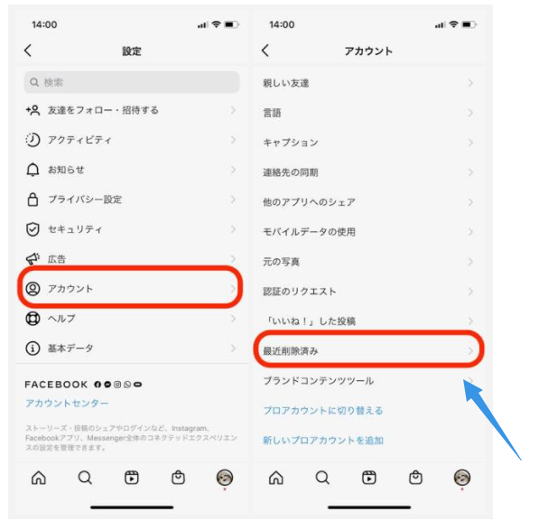 プロフィール画面右上の設定ボタンからアカウントを開き、最近削除済みをタップしてください。