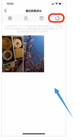 画面上部のストーリータブ(丸マーク)をタップすると、削除したストーリーの一覧が確認できます。