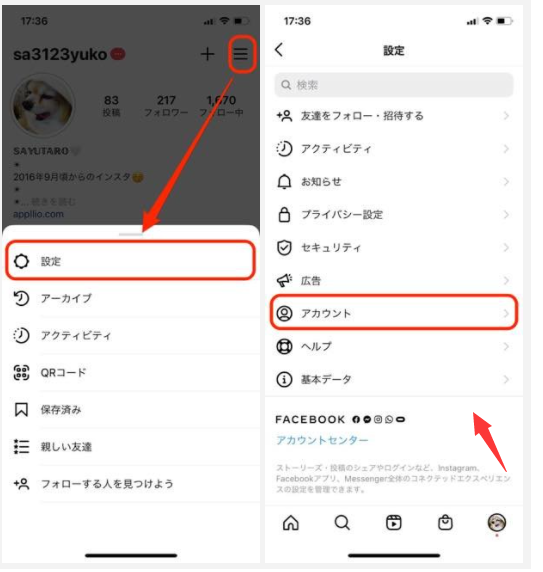 プロフィール画面右上のメニューから設定を開いたらアカウントを選択します。