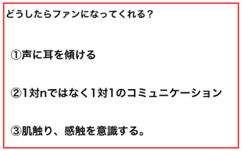 では、ファンはどうしたら増えるのか。ファンになってもらうために大事なのが、こちらの3つになります。