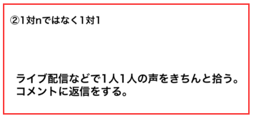 ライブ配信などでただ配信するだけでなく、しっかり1人ひとりのコメント、声をきちんと拾っていく必要があります。また、そのコメントにもしっかり返信をするというところも大事です。